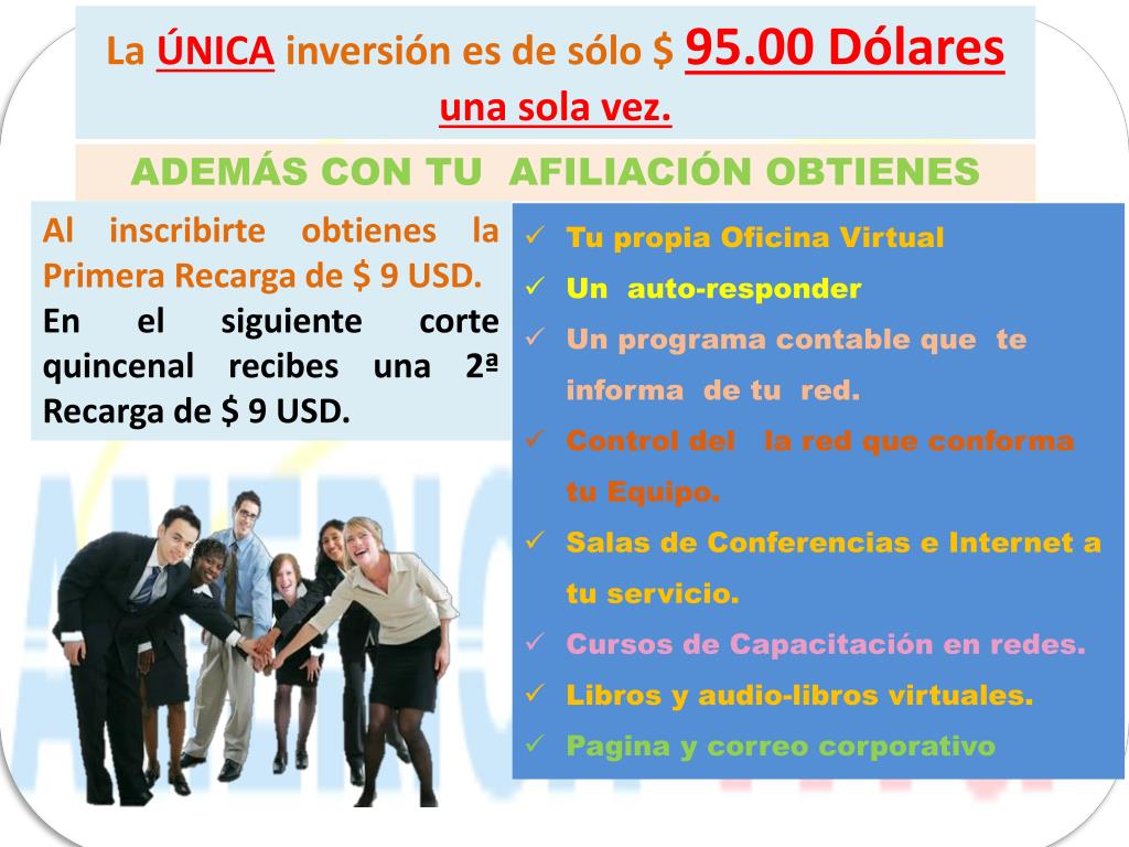 La ÚNICA inversión es de sólo $ 95.00 Dólares una sola vez. ADEMÁS CON TU AFILIACIÓN OBTIENES Al inscribirte obtienes la Primera Recarga de $ 9 USD. En el siguiente corte quincenal recibes una 2ª Recarga de $ 9 USD. • Tu propia Oficina Virtual • Un auto-responder • Un programa contable que te informa de tu red. • Control del la red que conforma tu Equipo. • Salas de Conferencias e Internet a tu servicio. • Cursos de Capacitación en redes. • Libros y audio-libros virtuales. • Pagina y correo corporativo