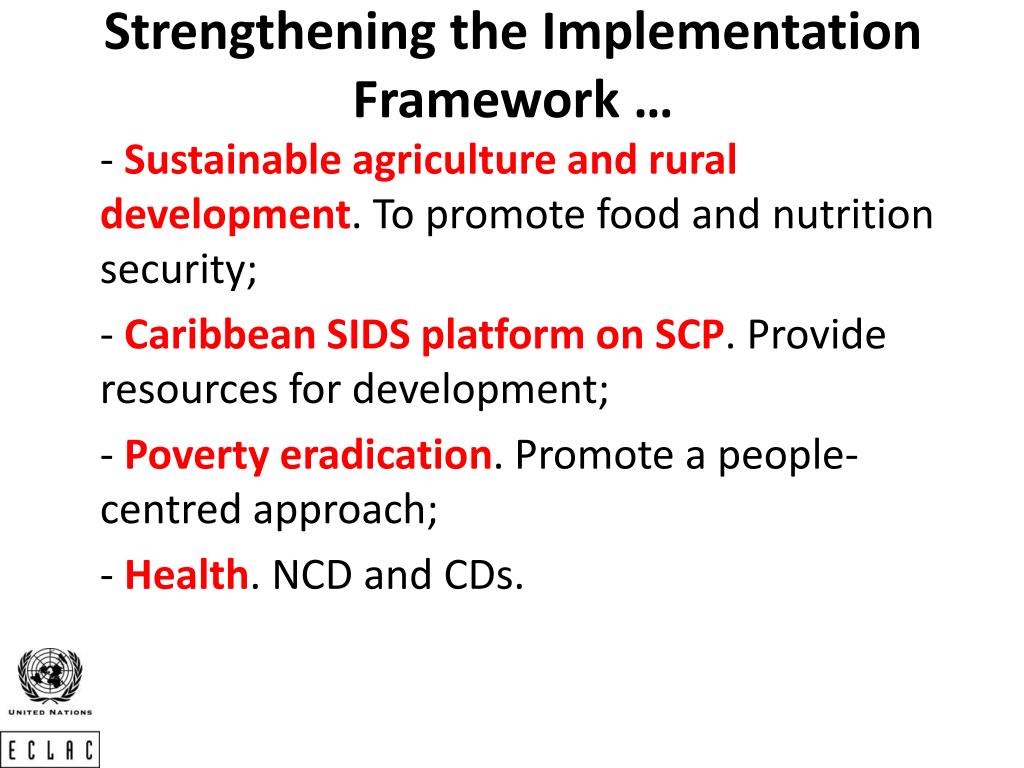 Strengthening the Implementation Framework … - Sustainable agriculture and rural development. To promote food and nutrition security; - Caribbean SIDS platform on SCP. Provide resources for development; - Poverty eradication. Promote a people-centred approach; - Health. NCD and CDs.