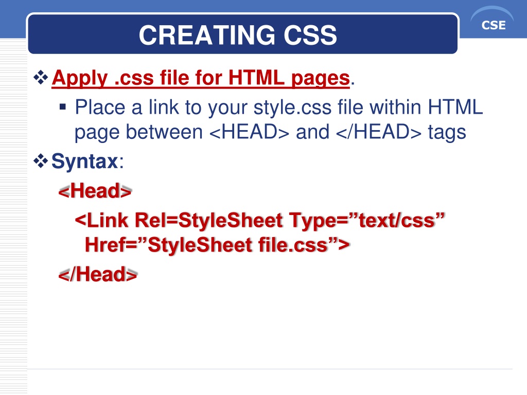 CREATING CSS • Apply .css file for HTML pages. • Place a link to your style.css file within HTML page between <HEAD> and </HEAD> tags • Syntax: <Head> <Link Rel=StyleSheet Type=”text/css” Href=”StyleSheet file.css”> </Head>