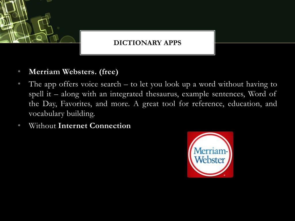 Dictionary apps • MerriamWebsters. (free) • The app offers voice search – to let you look up a word without having to spell it – along with an integrated thesaurus, example sentences, Word of the Day, Favorites, and more. A great tool for reference, education, and vocabulary building. • WithoutInternet Connection