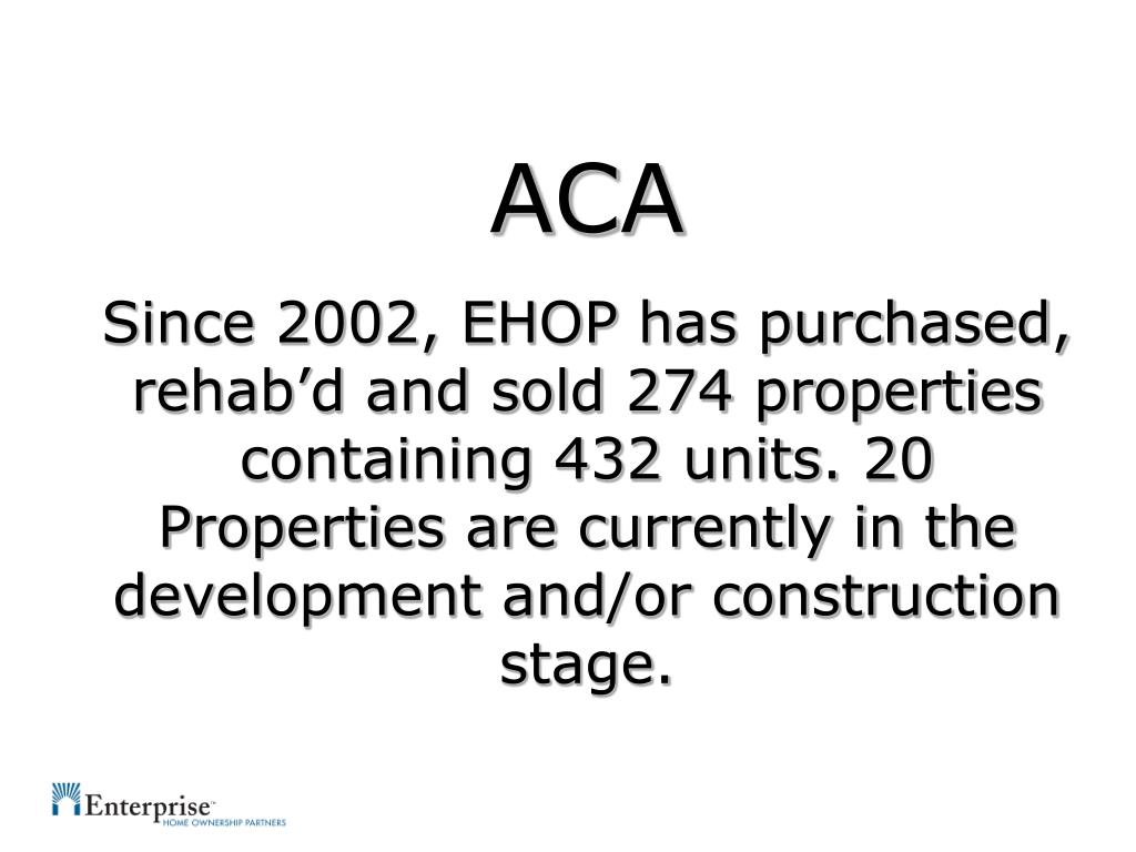 ACA Since 2002, EHOP has purchased, rehab’d and sold 274 properties containing 432 units. 20 Properties are currently in the development and/or construction stage.