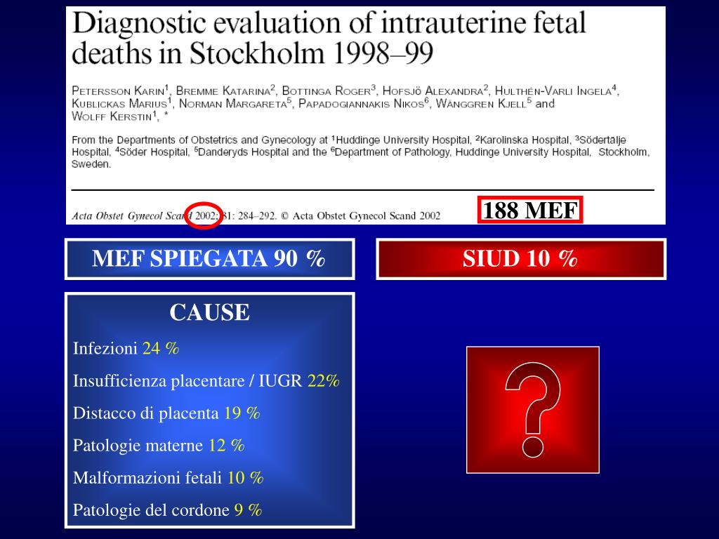 MEF SPIEGABILE STILLBIRTH Giustificata dall’esame autoptico del feto e degli annessi; dall’esame istologico del cordone ombelicale, della placenta, delle membrane e del feto “midollo allungato” e/o attraverso lo studio dei disordini metabolici. INSPIEGABILE : SIUD Sudden Intrauterine Unexplained Death Morte endouterina prima del parto di un feto con età gestazionale >/ = di 22 settimane complete o con un peso di almeno 500 grammi, che sia inaspettata in base alla storia clinica della paziente e della gravidanza, e per la quale l’autopsia del feto insieme con l’esame macroscopico e istologico del cordone ombelicale, della placenta e delle membrane, non siain grado di dimostrare la causa di morte.