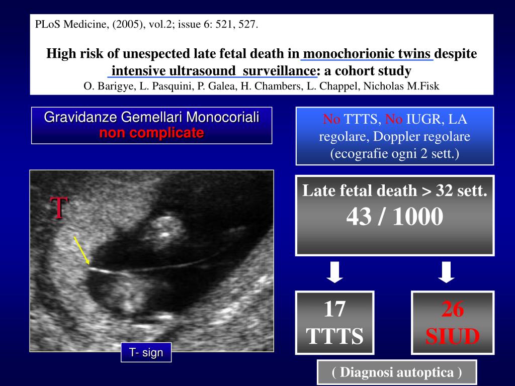 Gravidanze Gemellari Monocoriali non complicate T- sign PLoS Medicine, (2005), vol.2; issue 6: 521, 527. High risk of unespected late fetal death in monochorionic twins despite intensive ultrasound surveillance: a cohort study O. Barigye, L. Pasquini, P. Galea, H. Chambers, L. Chappel, Nicholas M.Fisk No TTTS, No IUGR, LA regolare, Doppler regolare (ecografie ogni 2 sett.) Late fetal death > 32 sett. 43 / 1000 17 TTTS 26 SIUD ( Diagnosi autoptica )
