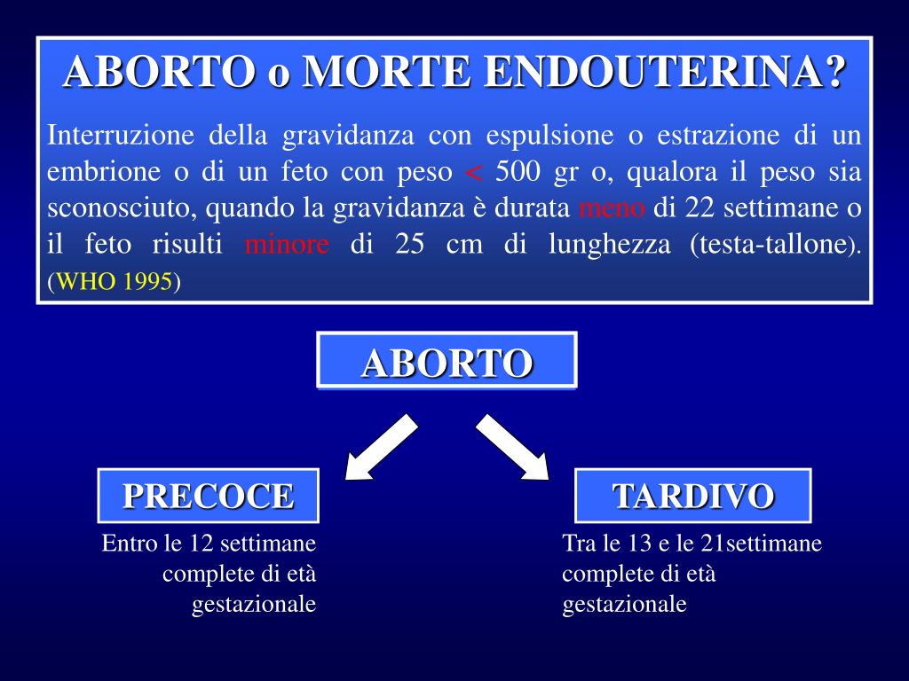 ABORTO o MORTE ENDOUTERINA? Interruzione della gravidanza con espulsione o estrazione di un embrione o di un feto con peso < 500 gr o, qualora il peso sia sconosciuto, quando la gravidanza è durata meno di 22 settimane o il feto risulti minore di 25 cm di lunghezza(testa-tallone). (WHO 1995) ABORTO PRECOCE TARDIVO Entro le 12 settimane complete di età gestazionale Tra le 13 e le 21settimane complete di età gestazionale