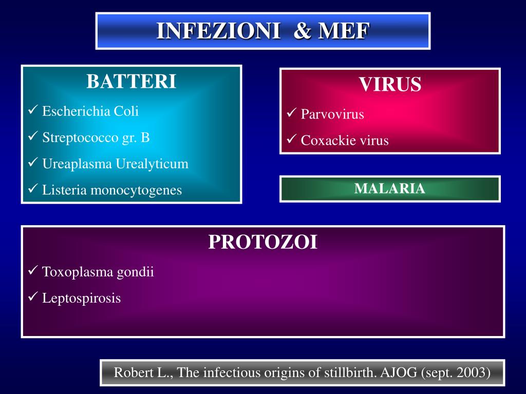 INFEZIONI & MEF • BATTERI • Escherichia Coli • Streptococco gr. B • Ureaplasma Urealyticum • Listeria monocytogenes • VIRUS • Parvovirus • Coxackie virus MALARIA • PROTOZOI • Toxoplasma gondii • Leptospirosis Robert L., The infectious origins of stillbirth. AJOG (sept. 2003)