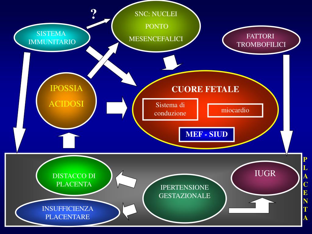 SNC: NUCLEI PONTO MESENCEFALICI ? SISTEMA IMMUNITARIO FATTORI TROMBOFILICI CUORE FETALE IPOSSIA ACIDOSI Sistema di conduzione miocardio MEF - SIUD PLACENTA DISTACCO DI PLACENTA IUGR IPERTENSIONE GESTAZIONALE INSUFFICIENZA PLACENTARE