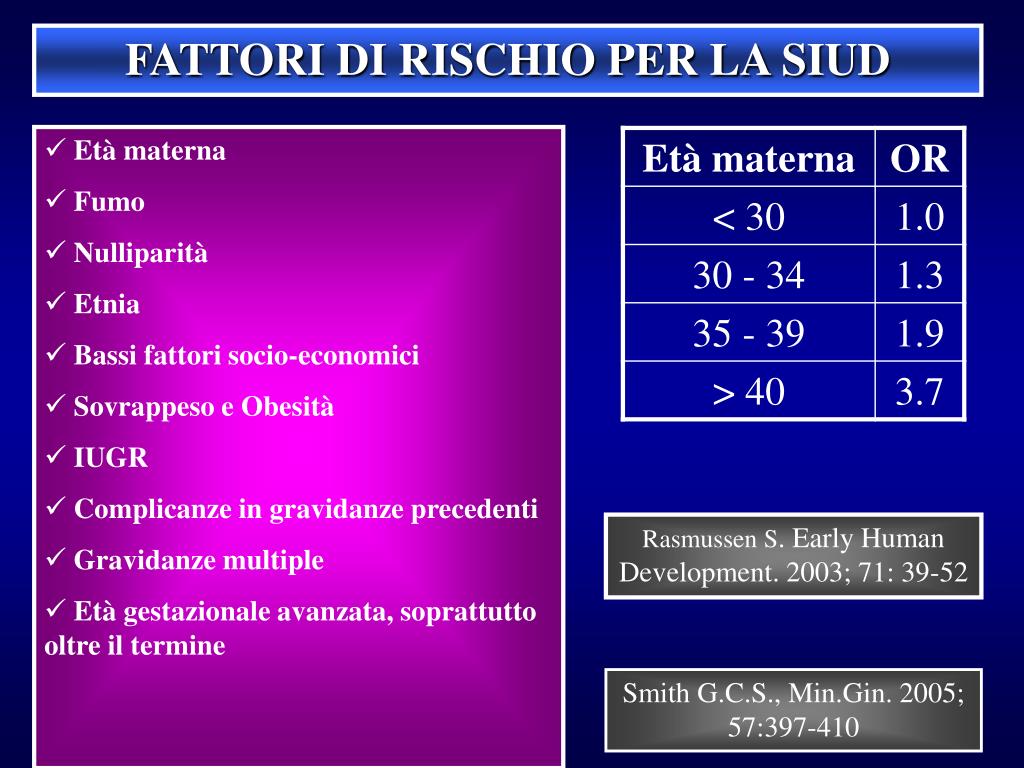 FATTORI DI RISCHIO PER LA SIUD • Età materna • Fumo • Nulliparità • Etnia • Bassi fattori socio-economici • Sovrappeso e Obesità • IUGR • Complicanze in gravidanze precedenti • Gravidanze multiple • Età gestazionale avanzata, soprattutto oltre il termine Rasmussen S. Early Human Development. 2003; 71: 39-52 Smith G.C.S., Min.Gin. 2005; 57:397-410
