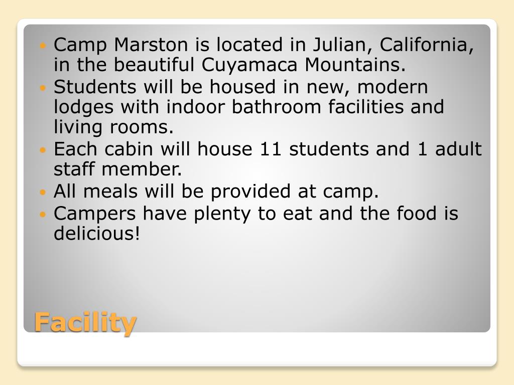 Camp Marston is located in Julian, California, in the beautiful Cuyamaca Mountains. • Students will be housed in new, modern lodges with indoor bathroom facilities and living rooms. • Each cabin will house 11 students and 1 adult staff member. • All meals will be provided at camp. • Campers have plenty to eat and the food is delicious! Facility