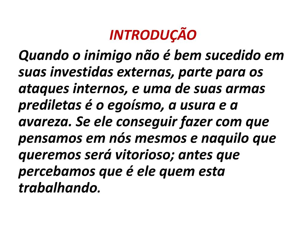 INTRODUÇÃO Quando o inimigo não é bem sucedido em suas investidas externas, parte para os ataques internos, e uma de suas armas prediletas é o egoísmo, a usura e a avareza. Se ele conseguir fazer com que pensamos em nós mesmos e naquilo que queremos será vitorioso; antes que percebamos que é ele quem esta trabalhando.