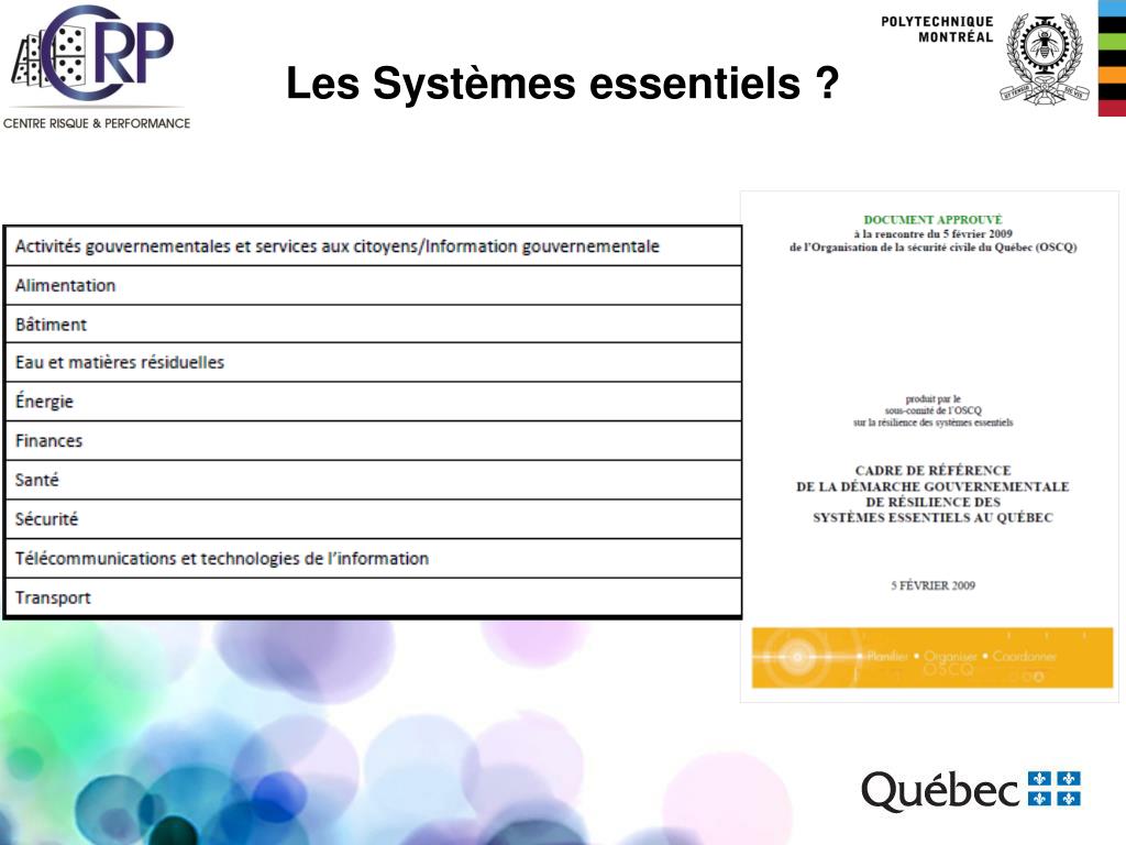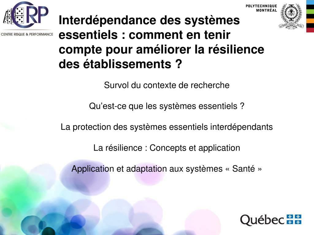 Interdépendance des systèmes essentiels : comment en tenir compte pour améliorer la résilience des établissements ? Survol du contexte de recherche Qu’est-ce que les systèmes essentiels ? La protection des systèmes essentiels interdépendants La résilience : Concepts et application Application et adaptation aux systèmes « Santé »