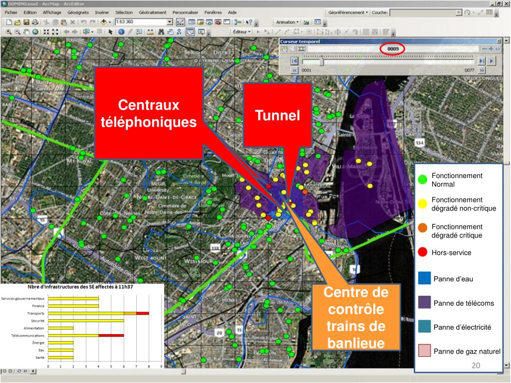 Centraux téléphoniques Tunnel Fonctionnement Normal Fonctionnement dégradé non-critique Fonctionnement dégradé critique Hors-service Panne d’eau Panne de télécoms Panne d’électricité Panne de gaz naturel Centre de contrôle trains de banlieue