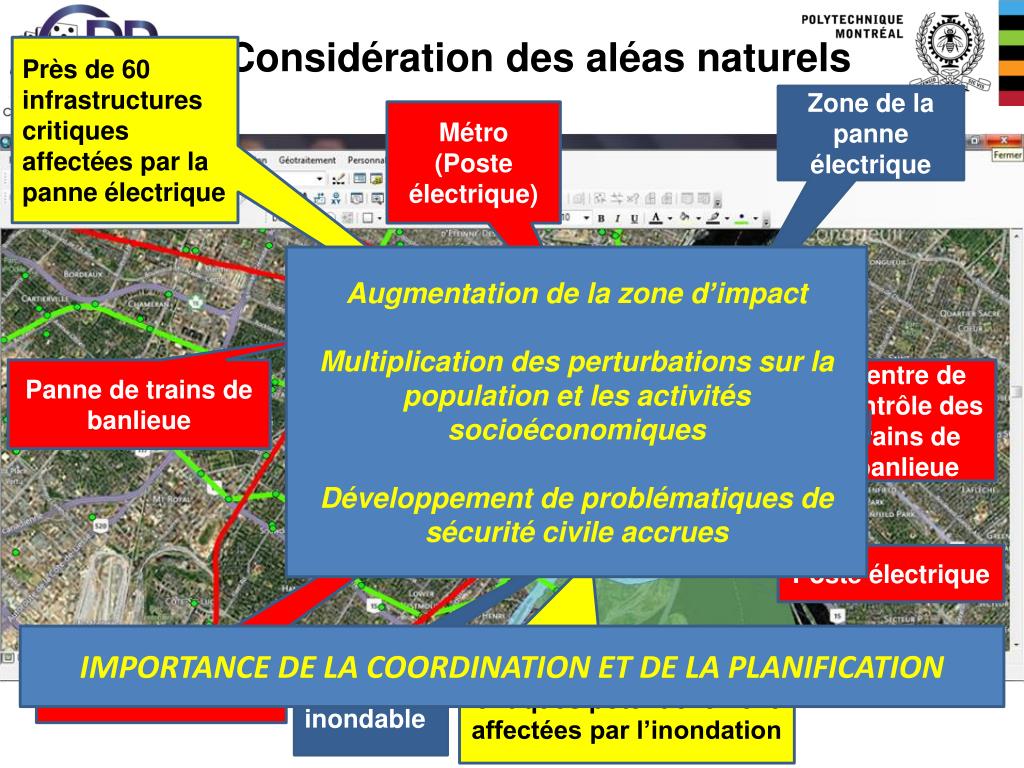Considération des aléas naturels Près de 60 infrastructures critiques affectées par la panne électrique Zone de la panne électrique Métro (Poste électrique) Augmentation de la zone d’impact Multiplication des perturbations sur la population et les activités socioéconomiques Développement de problématiques de sécurité civile accrues Panne de trains de banlieue Centre de contrôle des trains de banlieue Poste électrique IMPORTANCE DE LA COORDINATION ET DE LA PLANIFICATION 5 infrastructures critiques potentiellement affectées par l’inondation Zone inondable Panne de métro