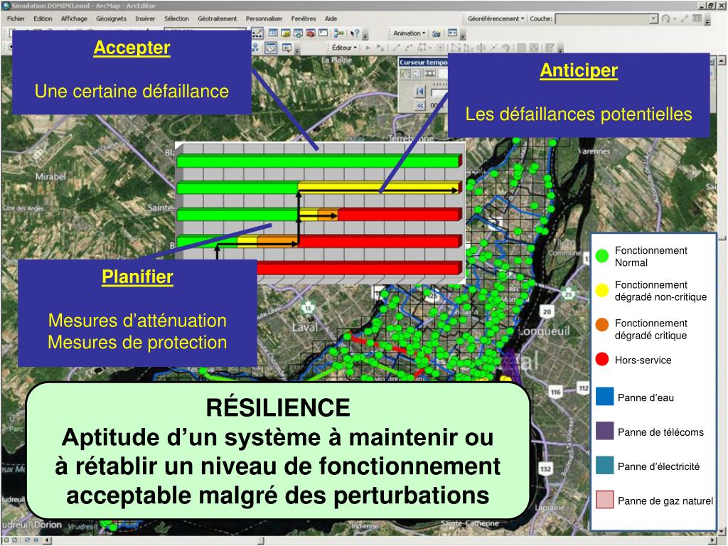 Accepter Une certaine défaillance Anticiper Les défaillances potentielles Fonctionnement Normal Fonctionnement dégradé non-critique Fonctionnement dégradé critique Hors-service Planifier Mesures d’atténuation Mesures de protection Panne d’eau Panne de télécoms Panne d’électricité RÉSILIENCE Aptitude d’un système à maintenir ou à rétablir un niveau de fonctionnement acceptable malgré des perturbations Panne de gaz naturel