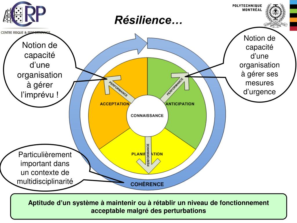 Résilience… Notion de capacité d’une organisation à gérer ses mesures d’urgence Notion de capacité d’une organisation à gérer l’imprévu ! Particulièrement important dans un contexte de multidisciplinarité Aptitude d’un système à maintenir ou à rétablir un niveau de fonctionnement acceptable malgré des perturbations
