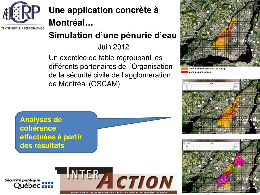 Une application concrète à Montréal… Simulation d’une pénurie d’eau Juin 2012 Un exercice de table regroupant les différents partenaires de l’Organisation de la sécurité civile de l’agglomération de Montréal (OSCAM) Analyses de cohérence effectuées à partir des résultats