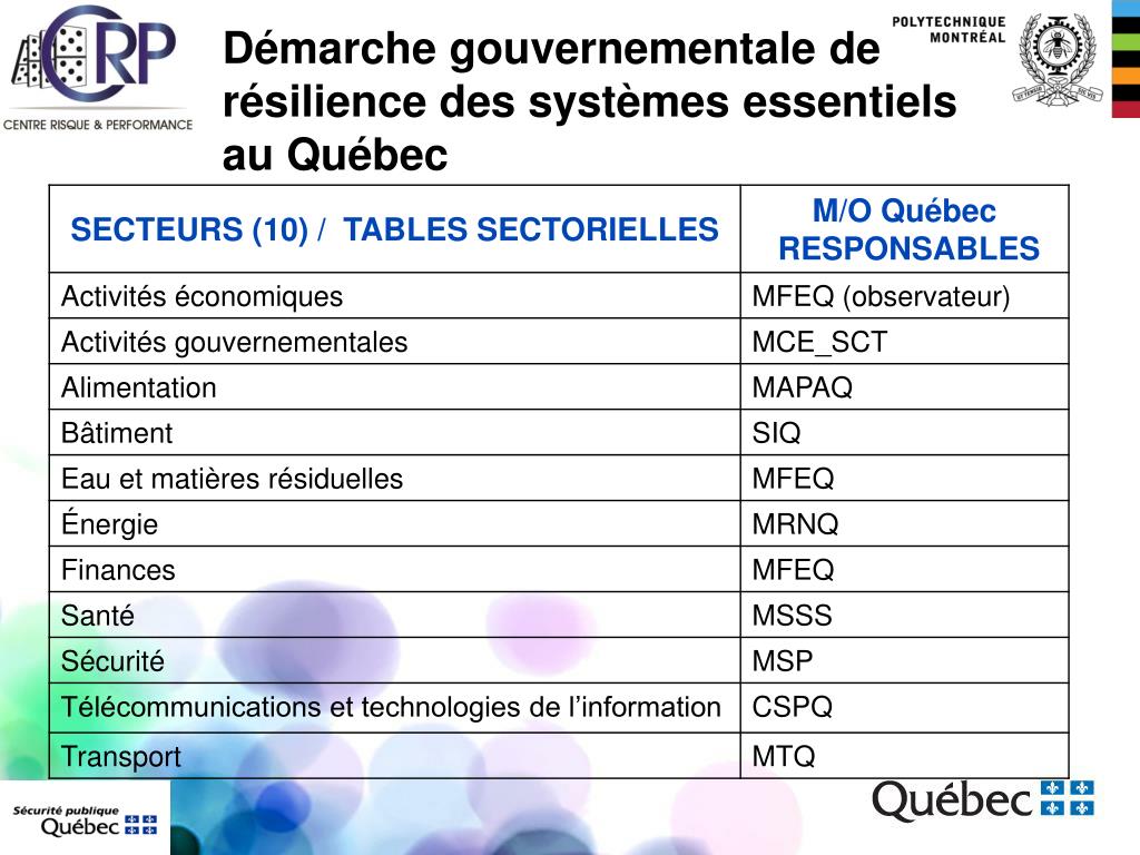 Démarche gouvernementale de résilience des systèmes essentiels au Québec • Présentation du projet à l’OSCQ - Septembre 2007. • Préparation d’un projet de Cadre de référence pour la démarche : • Identification des M/O partenaires (près de 15); • Consultations. • Adoption du cadre de référence par l’OSCQ : • Février 2009. • Remise du rapport de la 1ère analyse de résilience : • 2012.