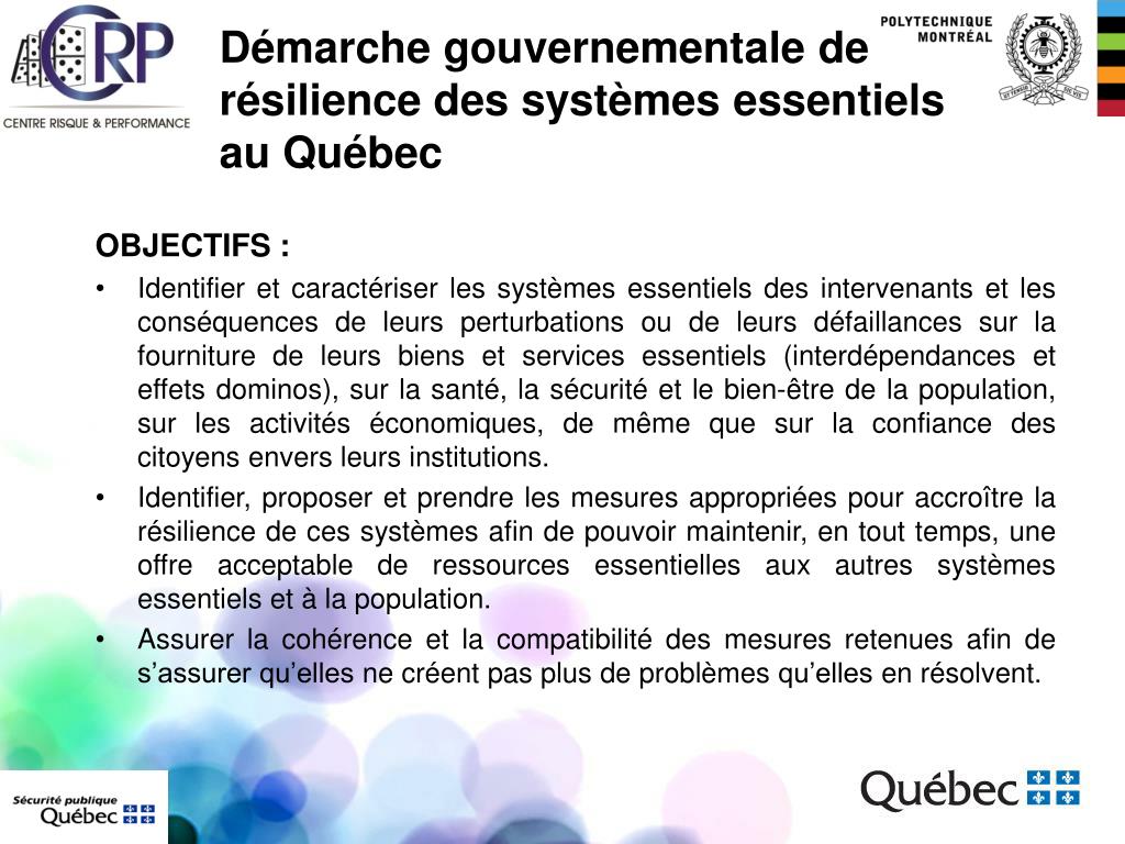 Démarche gouvernementale de résilience des systèmes essentiels au Québec • OBJECTIFS : • Identifier et caractériser les systèmes essentiels des intervenants et les conséquences de leurs perturbations ou de leurs défaillances sur la fourniture de leurs biens et services essentiels (interdépendances et effets dominos), sur la santé, la sécurité et le bien-être de la population, sur les activités économiques, de même que sur la confiance des citoyens envers leurs institutions. • Identifier, proposer et prendre les mesures appropriées pour accroître la résilience de ces systèmes afin de pouvoir maintenir, en tout temps, une offre acceptable de ressources essentielles aux autres systèmes essentiels et à la population. • Assurer la cohérence et la compatibilité des mesures retenues afin de s’assurer qu’elles ne créent pas plus de problèmes qu’elles en résolvent.