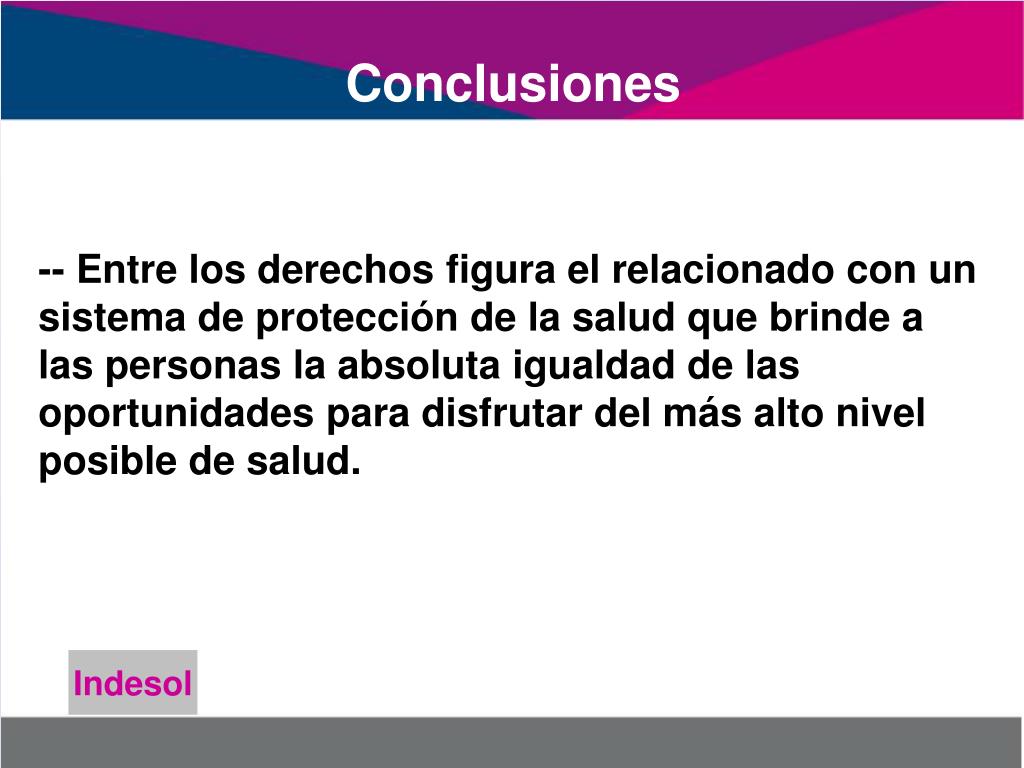 Conclusiones -- Entre los derechos figura el relacionado con un sistema de protección de la salud que brinde a las personas la absoluta igualdad de las oportunidades para disfrutar del más alto nivel posible de salud. Indesol