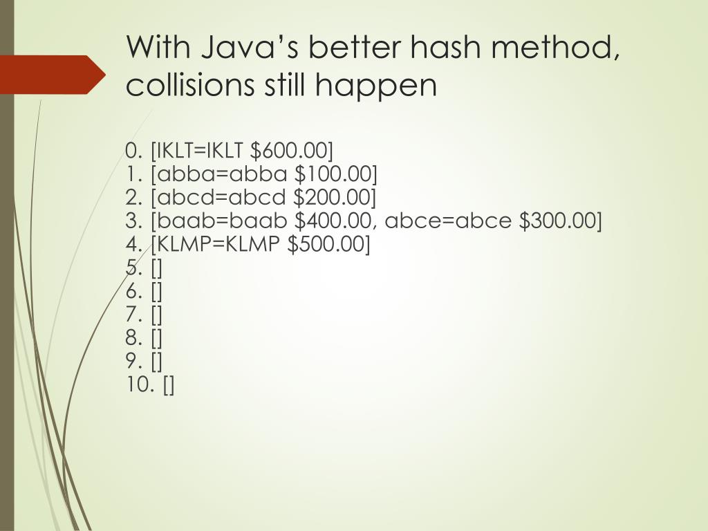 With Java’s better hash method,collisions still happen 0. [IKLT=IKLT $600.00] 1. [abba=abba $100.00] 2. [abcd=abcd $200.00] 3. [baab=baab $400.00, abce=abce $300.00] 4. [KLMP=KLMP $500.00] 5. [] 6. [] 7. [] 8. [] 9. [] 10. []