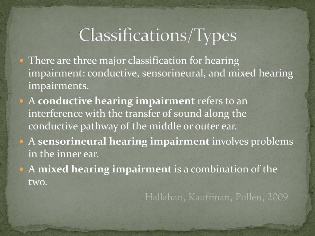 Classifications/Types • There are three major classification for hearing impairment: conductive, sensorineural, and mixed hearing impairments. • A conductive hearing impairment refers to an interference with the transfer of sound along the conductive pathway of the middle or outer ear. • A sensorineural hearing impairment involves problems in the inner ear. • A mixed hearing impairment is a combination of the two. Hallahan, Kauffman, Pullen, 2009