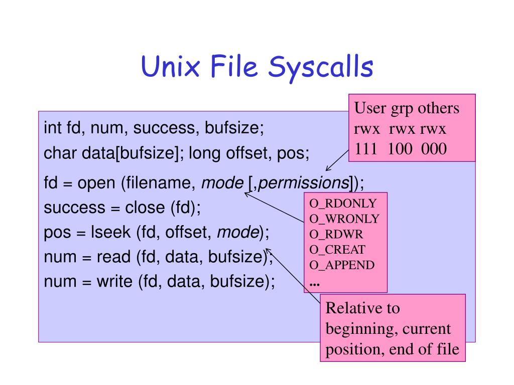 User grp others rwx rwx rwx 111 100 000 O_RDONLYO_WRONLY O_RDWR O_CREAT O_APPEND ... Relative to beginning, current position, end of file Unix File Syscalls int fd, num, success, bufsize; char data[bufsize]; long offset, pos; fd = open (filename, mode [,permissions]); success = close (fd); pos = lseek (fd, offset, mode); num = read (fd, data, bufsize); num = write (fd, data, bufsize);