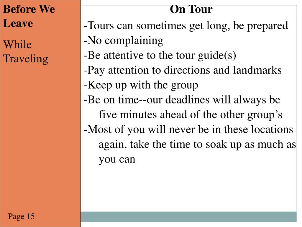 Chapter Before We Leave While Traveling On Tour -Tours can sometimes get long, be prepared -No complaining -Be attentive to the tour guide(s) -Pay attention to directions and landmarks -Keep up with the group -Be on time--our deadlines will always be five minutes ahead of the other group’s -Most of you will never be in these locations again, take the time to soak up as much as you can Page 15