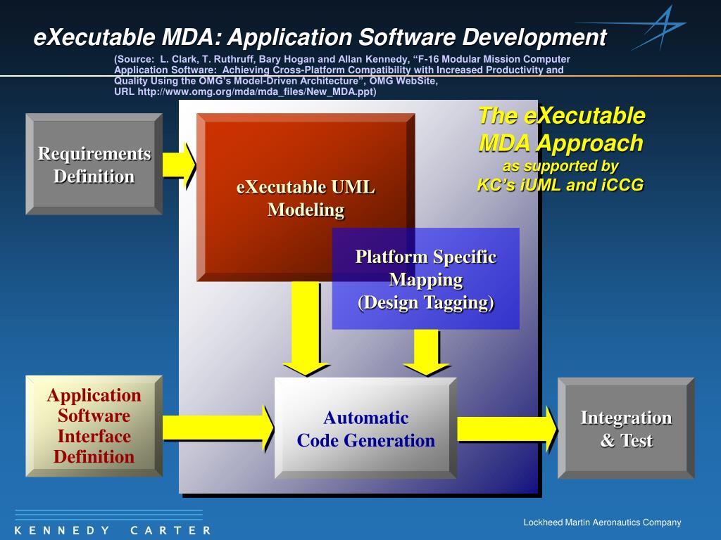 eXecutable MDA: Application Software Development (Source: L. Clark, T. Ruthruff, Bary Hogan and Allan Kennedy, “F-16 Modular Mission Computer Application Software: Achieving Cross-Platform Compatibility with Increased Productivity and Quality Using the OMG’s Model-Driven Architecture”, OMG WebSite, URL http://www.omg.org/mda/mda_files/New_MDA.ppt) The eXecutable MDA Approach as supported by KC’s iUML and iCCG Requirements Definition eXecutable UML Modeling Platform Specific Mapping (Design Tagging) Application Software Interface Definition Automatic Code Generation Integration & Test