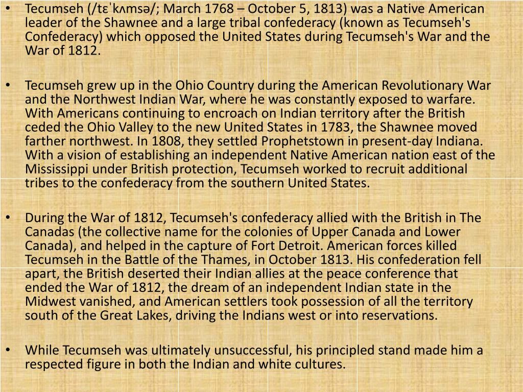Tecumseh (/tɛˈkʌmsə/; March 1768 – October 5, 1813) was a Native American leader of the Shawnee and a large tribal confederacy (known as Tecumseh's Confederacy) which opposed the United States during Tecumseh's War and the War of 1812. Tecumseh grew up in the Ohio Country during the American Revolutionary War and the Northwest Indian War, where he was constantly exposed to warfare. With Americans continuing to encroach on Indian territory after the British ceded the Ohio Valley to the new United States in 1783, the Shawnee moved farther northwest. In 1808, they settled Prophetstown in present-day Indiana. With a vision of establishing an independent Native American nation east of the Mississippi under British protection, Tecumseh worked to recruit additional tribes to the confederacy from the southern United States. During the War of 1812, Tecumseh's confederacy allied with the British in The Canadas (the collective name for the colonies of Upper Canada and Lower Canada), and helped in the capture of Fort Detroit. American forces killed Tecumseh in the Battle of the Thames, in October 1813. His confederation fell apart, the British deserted their Indian allies at the peace conference that ended the War of 1812, the dream of an independent Indian state in the Midwest vanished, and American settlers took possession of all the territory south of the Great Lakes, driving the Indians west or into reservations. While Tecumseh was ultimately unsuccessful, his principled stand made him a respected figure in both the Indian and white cultures.