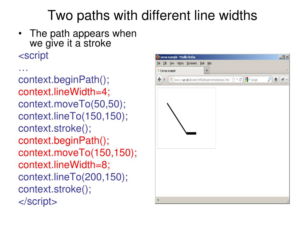 Two paths with different line widths • The path appears when we give it a stroke <script … context.beginPath(); context.lineWidth=4; context.moveTo(50,50); context.lineTo(150,150); context.stroke(); context.beginPath(); context.moveTo(150,150); context.lineWidth=8; context.lineTo(200,150); context.stroke(); </script>
