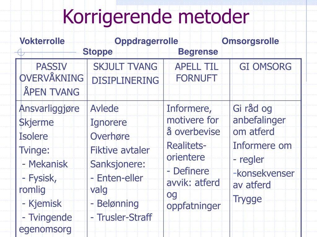 Korrigerende metoder Vokterrolle Oppdragerrolle Omsorgsrolle Stoppe Begrense