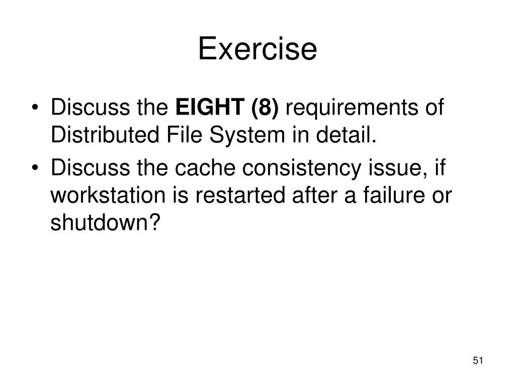 Exercise • Discuss the EIGHT (8) requirements of Distributed File System in detail. • Discuss the cache consistency issue, if workstation is restarted after a failure or shutdown?