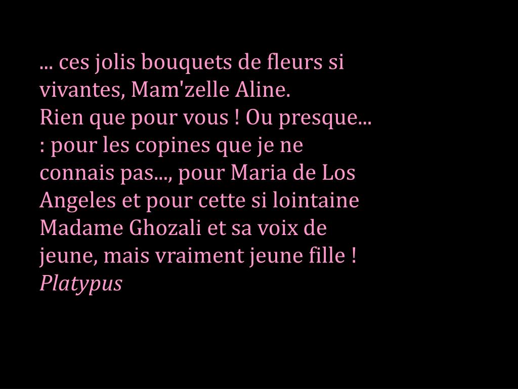... ces jolis bouquets de fleurs si vivantes, Mam'zelle Aline. Rien que pour vous ! Ou presque... : pour les copines que je ne connais pas..., pour Maria de Los Angeles et pour cette si lointaine Madame Ghozali et sa voix de jeune, mais vraiment jeune fille ! Platypus