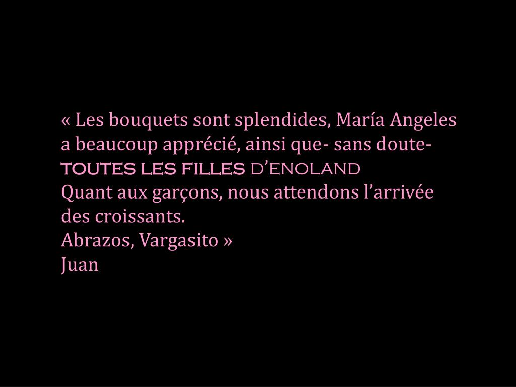 « Les bouquets sont splendides, María Angeles a beaucoup apprécié, ainsi que- sans doute- toutes les filles d’enoland Quant aux garçons, nous attendons l’arrivée des croissants. Abrazos, Vargasito » Juan