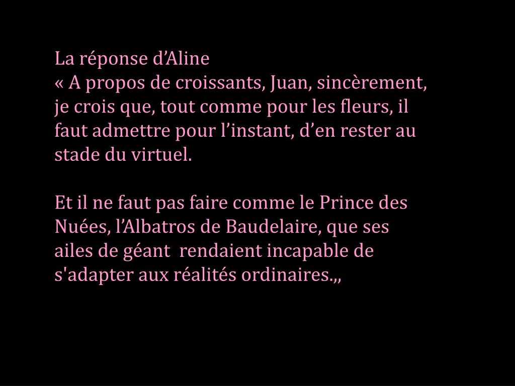La réponse d’Aline « A propos de croissants, Juan, sincèrement, je crois que, tout comme pour les fleurs, il faut admettre pour l’instant, d’en rester au stade du virtuel. Et il ne faut pas faire comme le Prince des Nuées, l’Albatros de Baudelaire, que ses ailes de géant rendaient incapable de s'adapter aux réalités ordinaires.,,