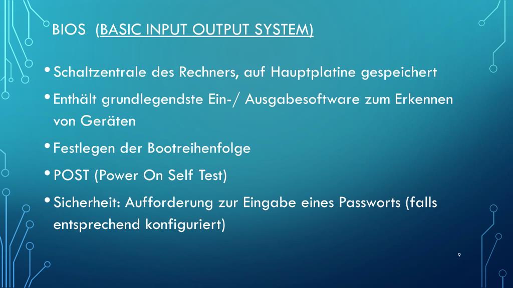 Bios (Basic Input Output System) • Schaltzentrale des Rechners, auf Hauptplatine gespeichert • Enthält grundlegendste Ein-/ Ausgabesoftware zum Erkennen von Geräten • Festlegen der Bootreihenfolge • POST (Power On Self Test) • Sicherheit: Aufforderung zur Eingabe eines Passworts (falls entsprechend konfiguriert)