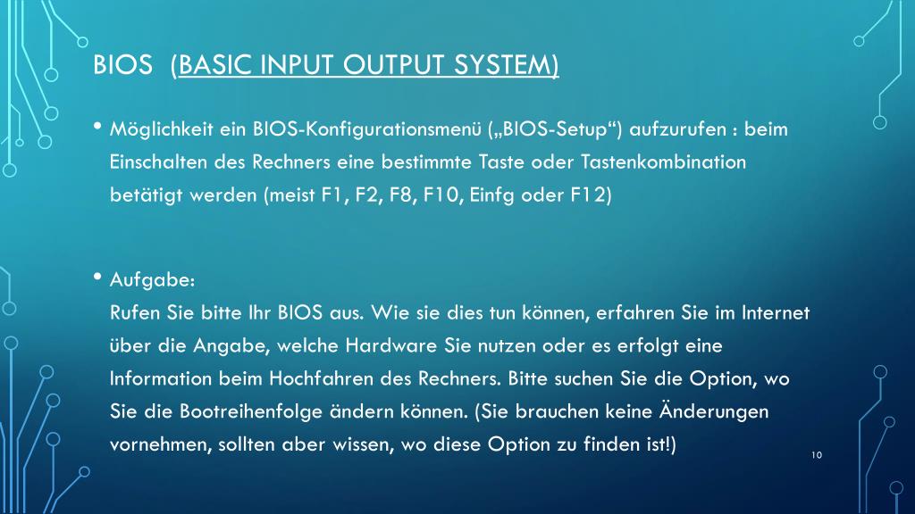 Bios (Basic Input Output System) • Möglichkeit ein BIOS-Konfigurationsmenü („BIOS-Setup“) aufzurufen : beim Einschalten des Rechners eine bestimmte Taste oder Tastenkombination betätigt werden (meist F1, F2, F8, F10, Einfg oder F12) • Aufgabe:Rufen Sie bitte Ihr BIOS aus. Wie sie dies tun können, erfahren Sie im Internet über die Angabe, welche Hardware Sie nutzen oder es erfolgt eine Information beim Hochfahren des Rechners. Bitte suchen Sie die Option, wo Sie die Bootreihenfolge ändern können. (Sie brauchen keine Änderungen vornehmen, sollten aber wissen, wo diese Option zu finden ist!)