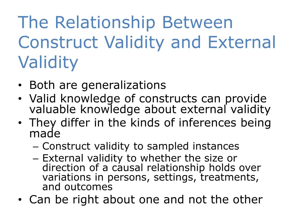 The Relationship Between Construct Validity and External Validity • Both are generalizations • Valid knowledge of constructs can provide valuable knowledge about external validity • They differ in the kinds of inferences being made • Construct validity to sampled instances • External validity to whether the size or direction of a causal relationship holds over variations in persons, settings, treatments, and outcomes • Can be right about one and not the other
