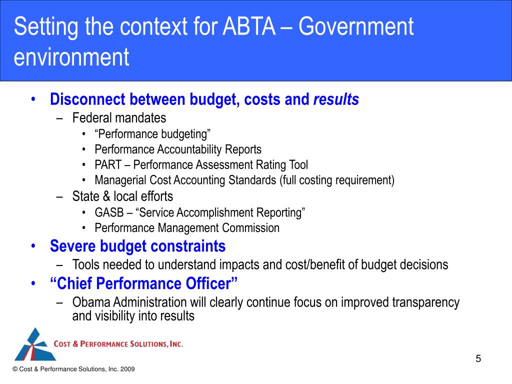 Setting the context for ABTA – Government environment • Disconnect between budget, costs and results • Federal mandates • “Performance budgeting” • Performance Accountability Reports • PART – Performance Assessment Rating Tool • Managerial Cost Accounting Standards (full costing requirement) • State & local efforts • GASB – “Service Accomplishment Reporting” • Performance Management Commission • Severe budget constraints • Tools needed to understand impacts and cost/benefit of budget decisions • “Chief Performance Officer” • Obama Administration will clearly continue focus on improved transparency and visibility into results