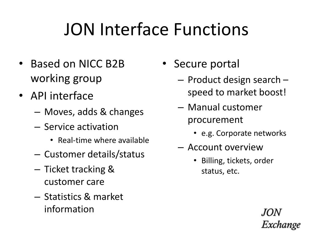 JON Interface Functions • Based on NICC B2B working group • API interface • Moves, adds & changes • Service activation • Real-time where available • Customer details/status • Ticket tracking & customer care • Statistics & market information • Secure portal • Product design search – speed to market boost! • Manual customer procurement • e.g. Corporate networks • Account overview • Billing, tickets, order status, etc.