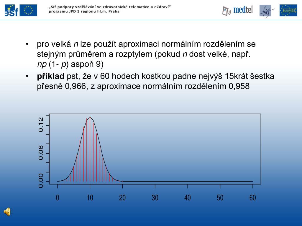 pro velká n lze použít aproximaci normálním rozdělením se stejným průměrem a rozptylem (pokud n dost velké, např. np (1- p) aspoň 9) • příklad pst, že v 60 hodech kostkou padne nejvýš 15krát šestka přesně 0,966, z aproximace normálním rozdělením 0,958