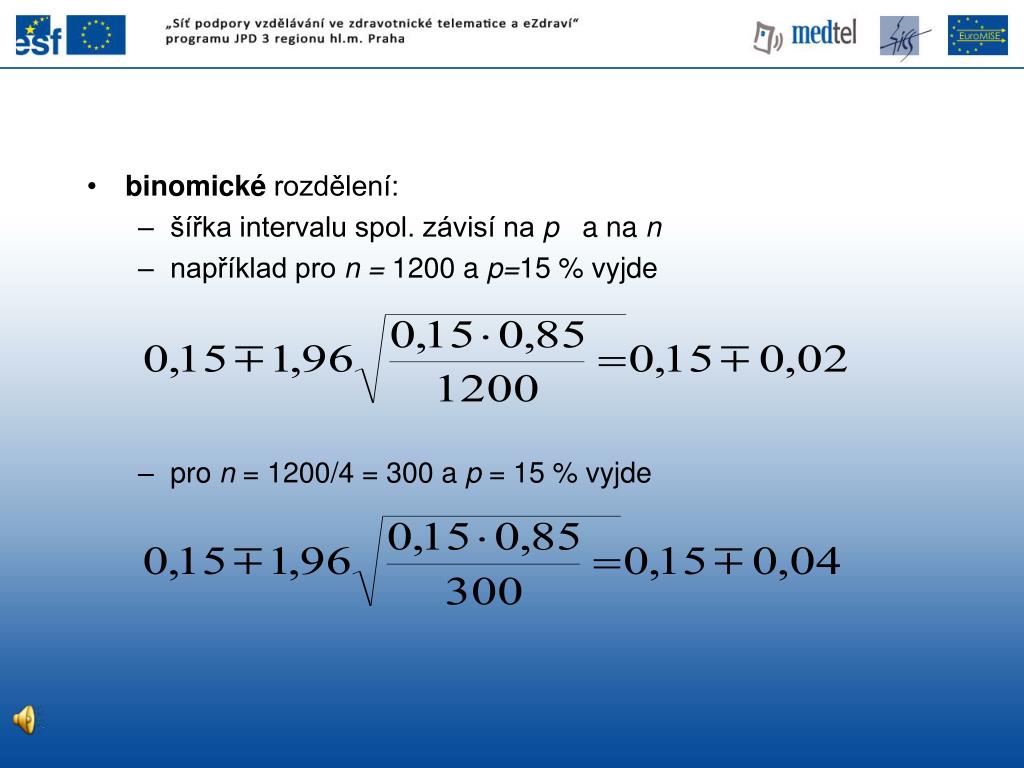 binomické rozdělení: šířka intervalu spol. závisí na p a na n například pro n = 1200 a p=15 % vyjde pro n = 1200/4 = 300 a p = 15 % vyjde