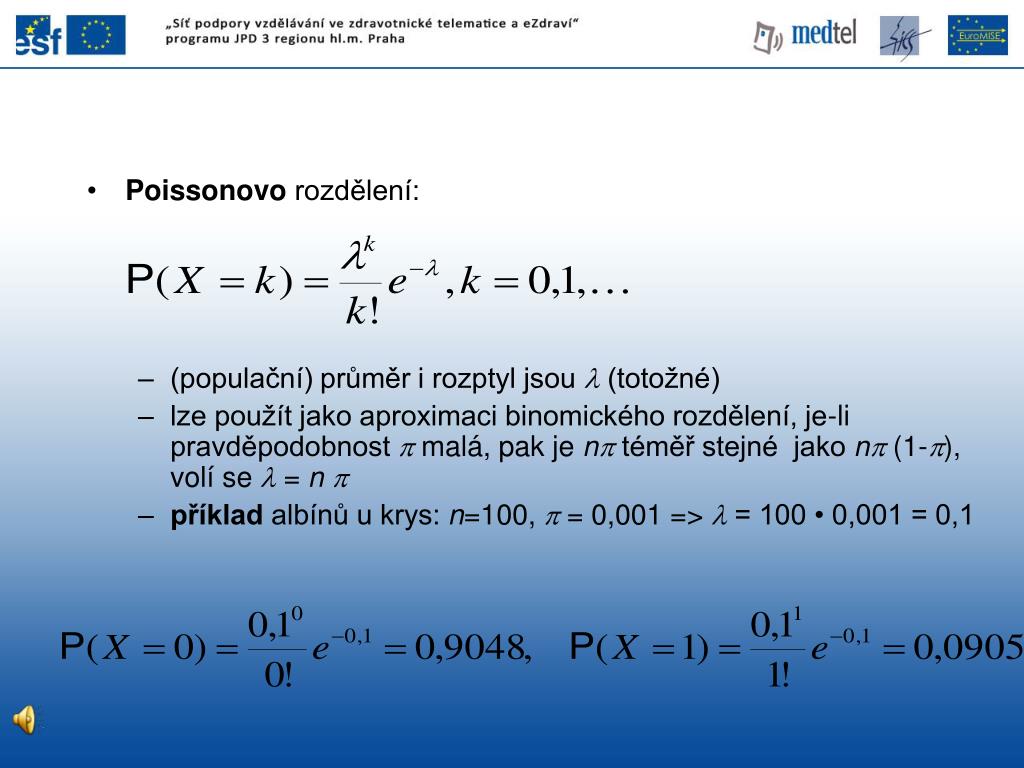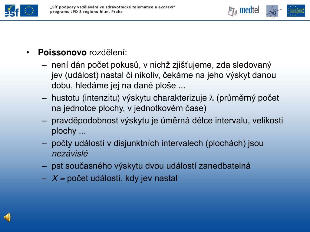 Poissonovo rozdělení: • není dán počet pokusů, v nichž zjišťujeme, zda sledovaný jev (událost) nastal či nikoliv, čekáme na jeho výskyt danou dobu, hledáme jej na dané ploše ... • hustotu (intenzitu) výskytu charakterizuje l (průměrný počet na jednotce plochy, v jednotkovém čase) • pravděpodobnost výskytu je úměrná délce intervalu, velikosti plochy ... • počty událostí v disjunktních intervalech (plochách) jsou nezávislé • pst současného výskytu dvou událostí zanedbatelná • X = počet událostí, kdy jev nastal