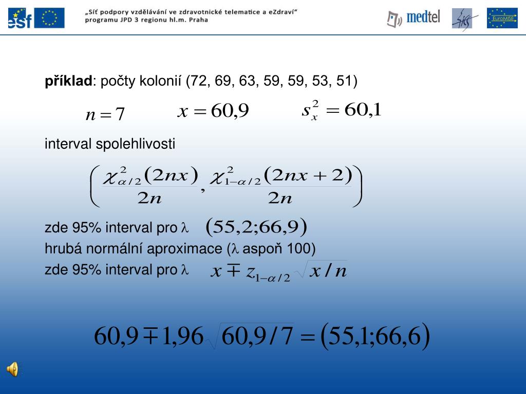 příklad: počty kolonií (72, 69, 63, 59, 59, 53, 51) interval spolehlivosti zde 95% interval prol hrubá normální aproximace (laspoň 100) zde 95% interval prol