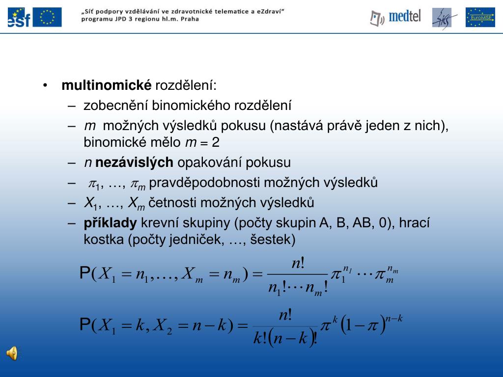 multinomické rozdělení: • zobecnění binomického rozdělení • m možných výsledků pokusu (nastává právě jeden z nich), binomické mělo m = 2 • nnezávislých opakování pokusu • p1, …, pm pravděpodobnosti možných výsledků • X1, …, Xmčetnosti možných výsledků • příklady krevní skupiny (počty skupin A, B, AB, 0), hrací kostka (počty jedniček, …, šestek)