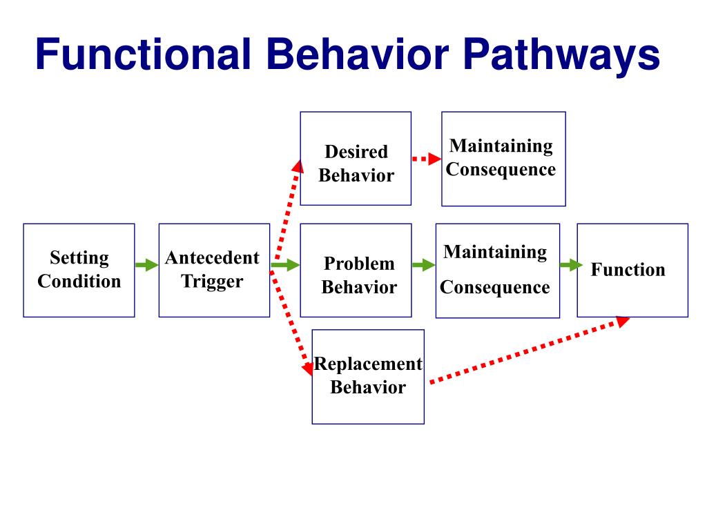 Functional Behavior Pathways MaintainingConsequence Desired Behavior Maintaining Consequence Setting Condition Antecedent Trigger Problem Behavior Function Replacement Behavior