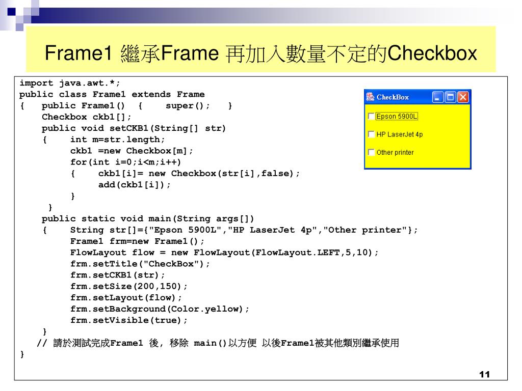 Frame1 繼承Frame 再加入數量不定的Checkbox import java.awt.*; public class Frame1 extends Frame { public Frame1() { super(); } Checkbox ckb1[]; public void setCKB1(String[] str) { int m=str.length; ckb1 =new Checkbox[m]; for(int i=0;i<m;i++) { ckb1[i]= new Checkbox(str[i],false); add(ckb1[i]); } } public static void main(String args[]) { String str[]={"Epson 5900L","HP LaserJet 4p","Other printer"}; Frame1 frm=new Frame1(); FlowLayout flow = new FlowLayout(FlowLayout.LEFT,5,10); frm.setTitle("CheckBox"); frm.setCKB1(str); frm.setSize(200,150); frm.setLayout(flow); frm.setBackground(Color.yellow); frm.setVisible(true); } // 請於測試完成Frame1 後, 移除 main()以方便 以後Frame1被其他類別繼承使用 }