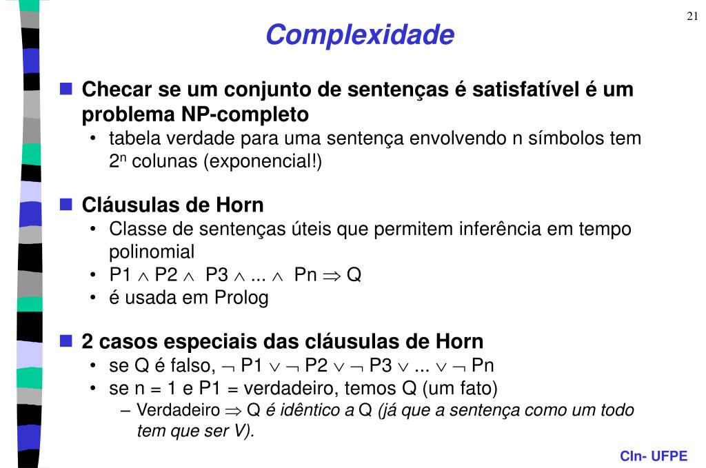 Complexidade • Checar se um conjunto de sentenças é satisfatível é um problema NP-completo • tabela verdade para uma sentença envolvendo n símbolos tem 2n colunas (exponencial!) • Cláusulas de Horn • Classe de sentenças úteis que permitem inferência em tempo polinomial • P1 P2 P3 ... Pn Q • é usada em Prolog • 2 casos especiais das cláusulas de Horn • se Q é falso, P1 P2 P3 ... Pn • se n = 1 e P1 = verdadeiro, temos Q (um fato) • Verdadeiro Q é idêntico a Q (já que a sentença como um todo tem que ser V).