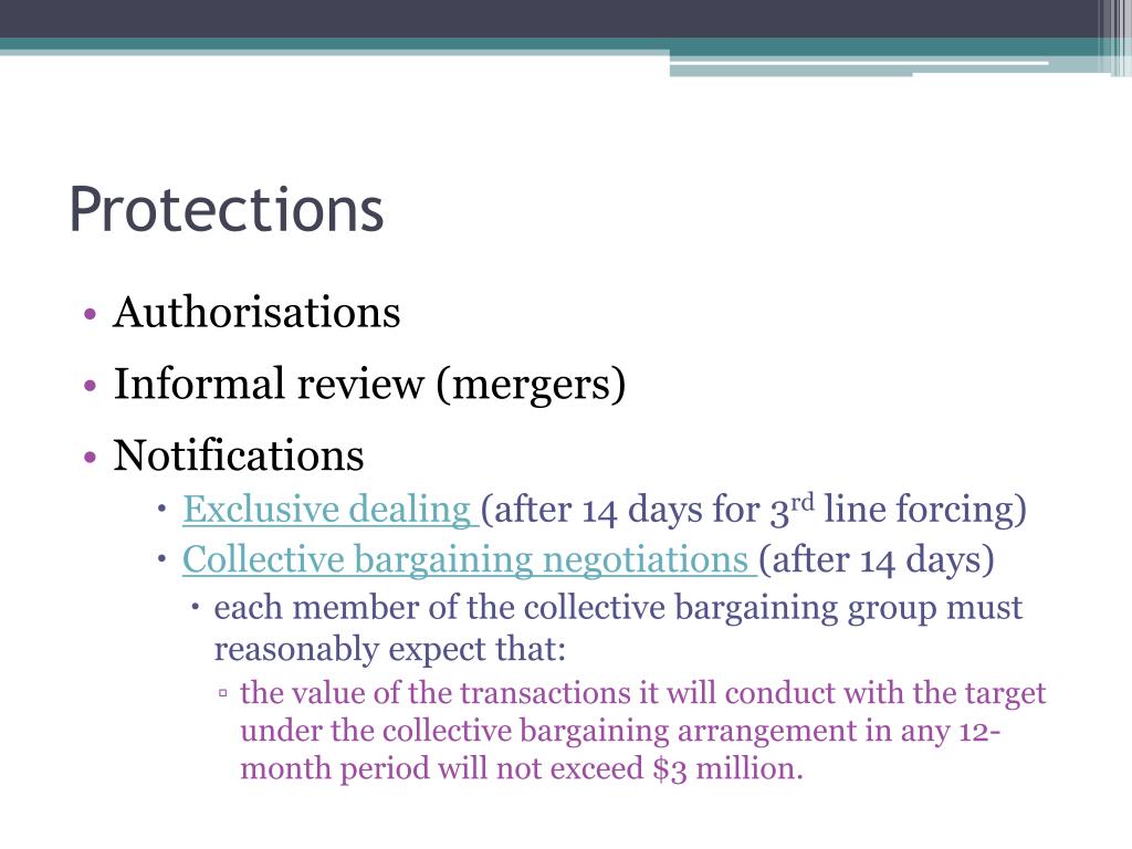 Protections • Authorisations • Informal review (mergers) • Notifications • Exclusive dealing (after 14 days for 3rd line forcing) • Collective bargaining negotiations (after 14 days) • each member of the collective bargaining group must reasonably expect that: • the value of the transactions it will conduct with the target under the collective bargaining arrangement in any 12-month period will not exceed $3 million.