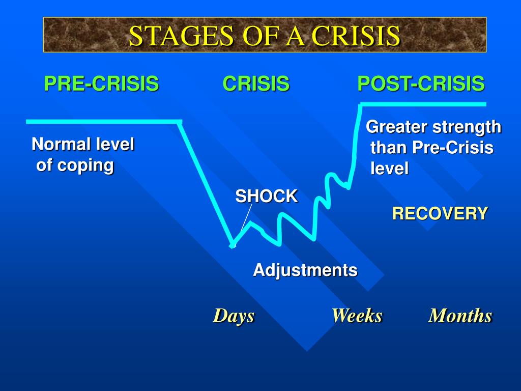 STAGES OF A CRISIS PRE-CRISIS CRISIS POST-CRISIS Greater strength than Pre-Crisis level Normal level of coping SHOCK RECOVERY Adjustments Days Weeks Months