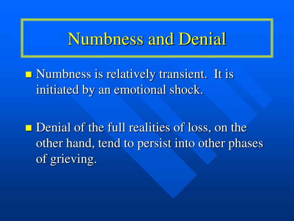 Numbness and Denial • Numbness is relatively transient. It is initiated by an emotional shock. • Denial of the full realities of loss, on the other hand, tend to persist into other phases of grieving.